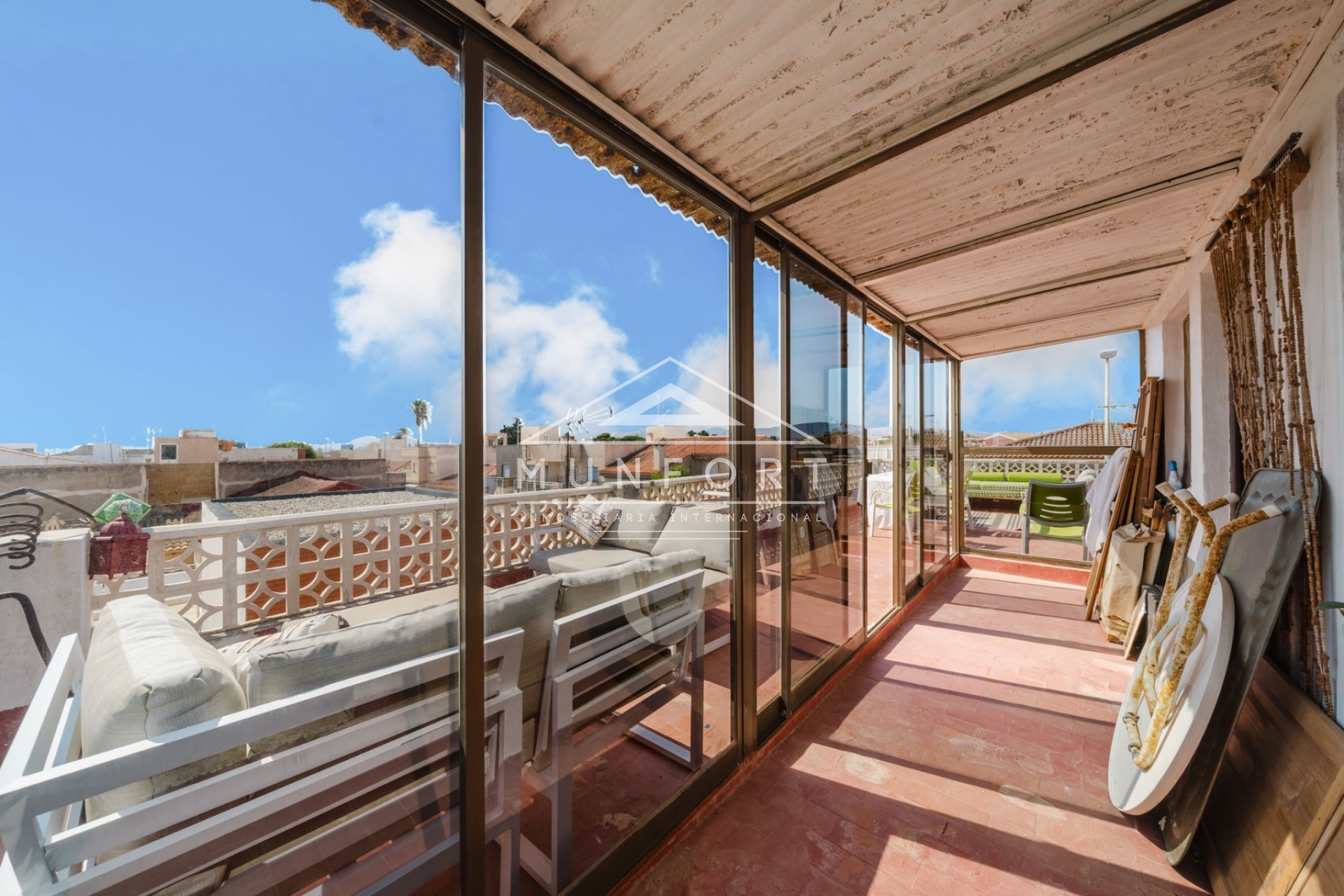 Twee-onder-een-kapwoning te koop in Los Urrutias met 140 m² gebouwd, met 4 slaapkamers, 2 badkamers, twee aparte keukens, privéterras en solarium met prachtig uitzicht op de Mar Menor. De woning is verdeeld over twee onafhankelijke verdiepingen met twee keukens, waardoor het veelzijdig gebruikt kan worden voor een groot gezin, vakantieverhuur of investering.