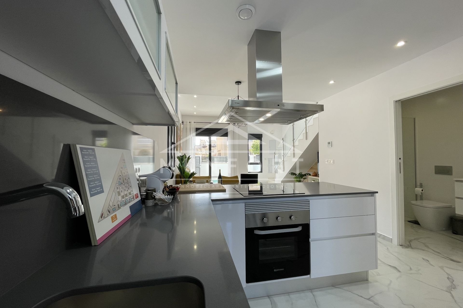 Exclusieve VILLA met 3 slaapkamers en 3 badkamers. Het heeft een prive zwembad met douche inbegrepen, het solarium is optioneel en mediterrane type tuin met siergrind en twee palmbomen. De keuken is in Amerikaanse stijl en uitgerust met hoge en lage kasten, compact kwarts werkblad, roestvrijstalen gootsteen onder het werkblad, DECORATIEVE HOED. Aansluiting voor oven, vaatwasser en wasmachine.